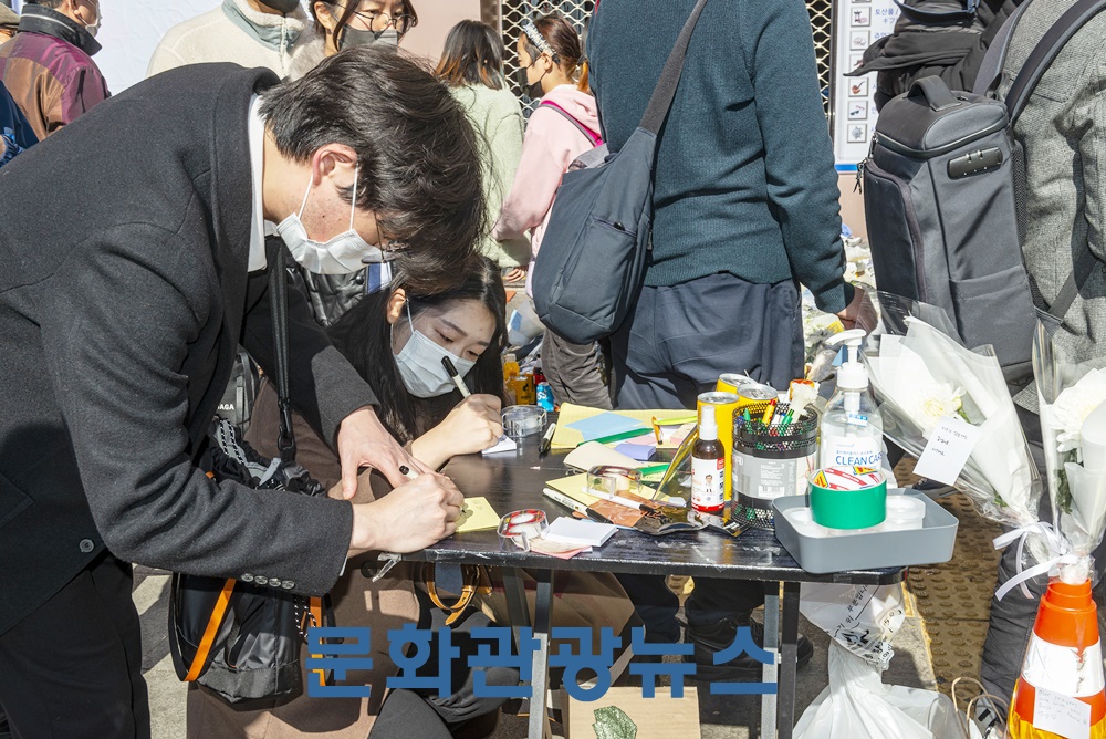 메모지에 추모 글을 적는 청춘 남녀가 카메라에 잡혔다. “국가의 존재 이유는 무엇인가”라고 적힌 메모지가 눈에 들어왔다. 어떤 시민은 이들이 남긴 메모를 소리 내어 읽으며 울먹이기도 했고, 커피와 음료를 놓고 고개를 숙여 묵념을 하기도 했다.