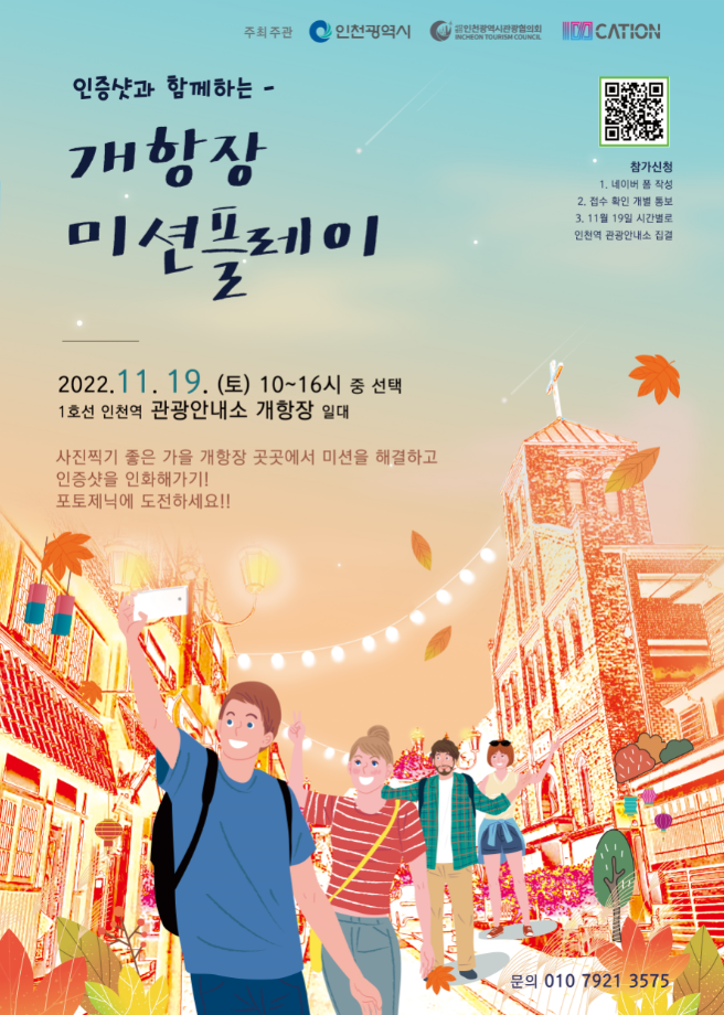 1호선 인천역 관광안내소에서는 오는 11월 19일 MZ세대를 대상으로 ‘개항장 미션플레이’를 진행한다. 안내소에서 팀별로 출발해 개항장 일대 주요관광지에서 미션 수행 후 안내소로 복귀하면 소정의 기념품과 기념사진을 제공한다.