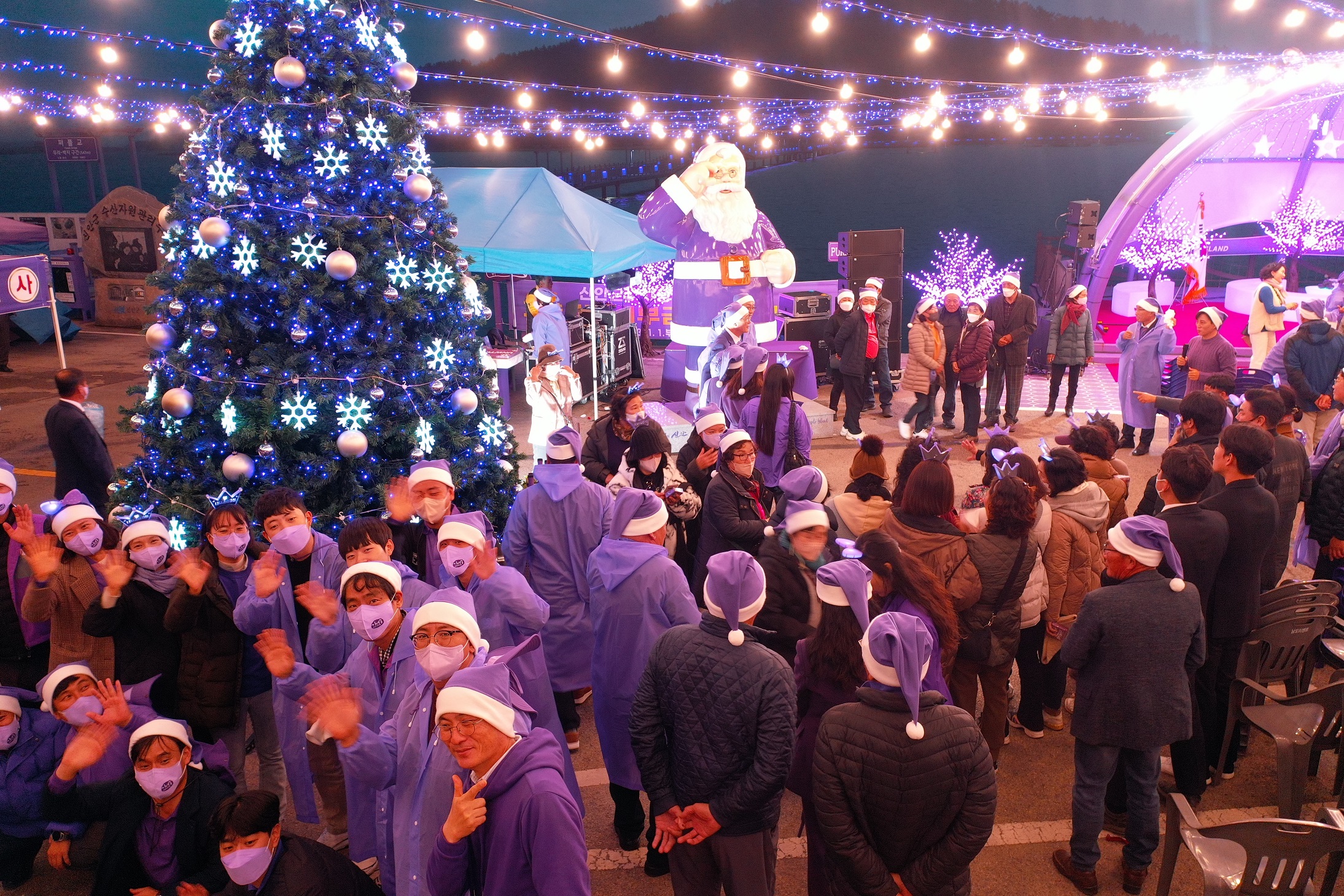퍼플섬에 연말 분위기가 물씬 풍기는 아름다운 조명의 대형 크리스마스트리와 보라색 옷을 입은 산타클로스가 방문객을 반갑게 맞이한다.