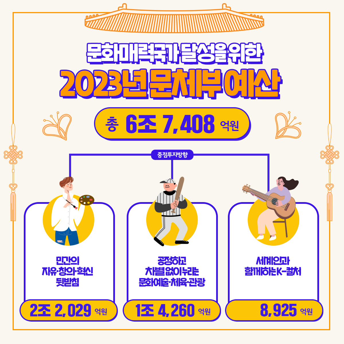 2023년 문체부 예산은 민간의 자유·창의 정신이 바탕이 된 한국문화(케이컬처)에 전 세계인의 갈채가 쏟아지는 지금의 기회를 놓치지 않고 대한민국이 문화매력국가, 문화번영의 시대로 나아가는 데 중점을 두었다. 문체부는 국민의 땀방울이 맺힌 세금을 적기에 집행해 도움이 필요한 현장에 보탬이 될 수 있도록 예산을 효율적으로 집행하는 데도 계속 힘쓸 방침이다.