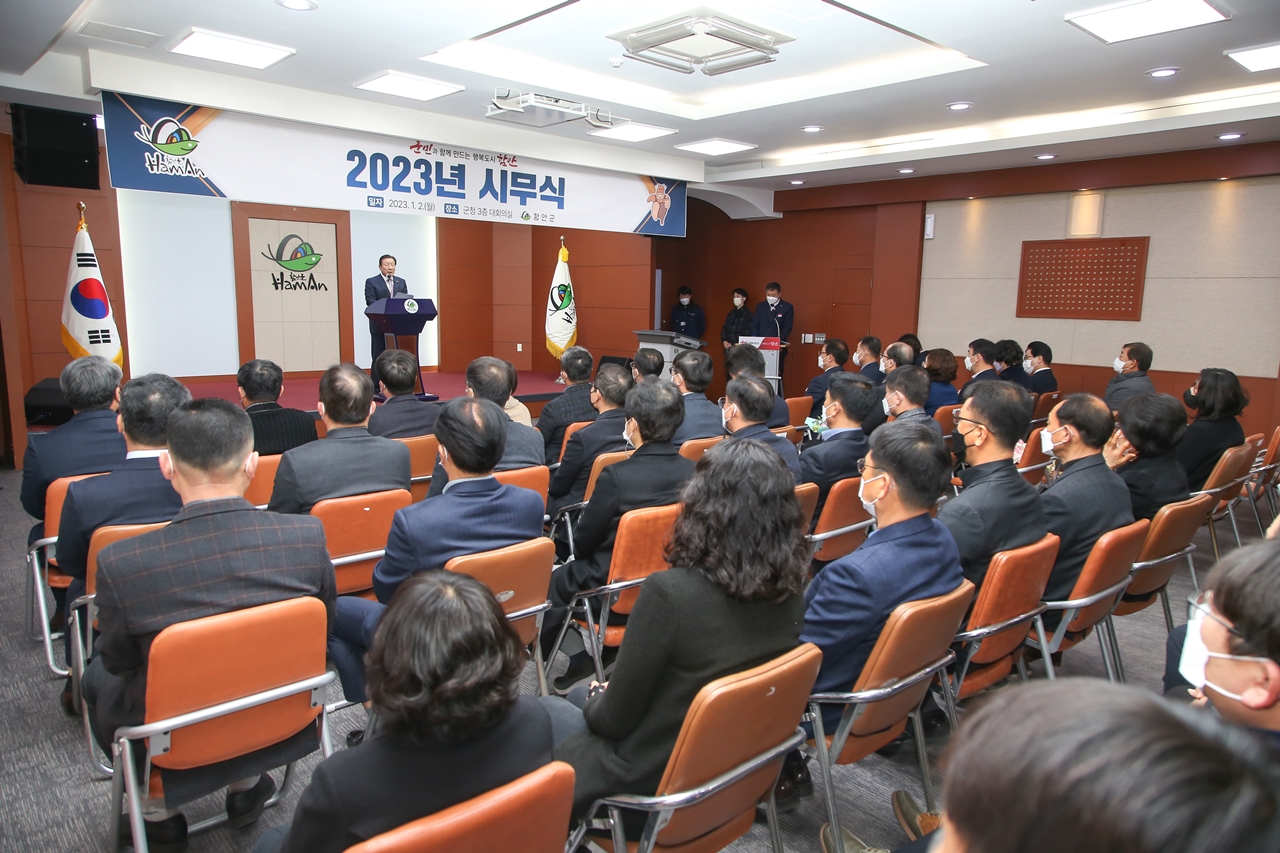 함안군은 2일 오전 9시 군청 3층 대회의실에서 150여 명의 공직자와 함께 시무식을 열어 2023년 계묘년 새해를 희망차게 출발했다.