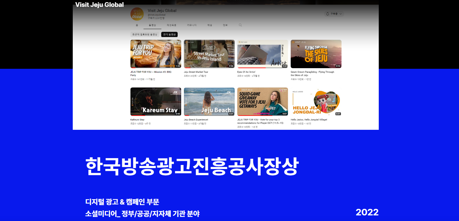 제주관광공사는 ‘Visit Jeju Global’ 유튜브 채널을 직항국가 중심의 ‘Visit Jeju Again’ 메시지로 타겟팅 하는 등 활발한 소통과 확산 전략을 추진한 점을 인정받아 공공기관 단독으로 한국방송광고진흥공사장상을 수상한 데 이어 ‘안전·안심 제주관광 이미지 확산’을 위해 추진한 「안심채움 캠페인」으로 정부·공공·지자체 기관 부문 최고상인 그랑프리까지 2개 부문에서 수상의 쾌거를 이뤄냈다.