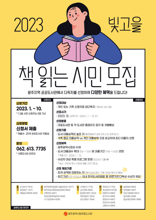 자세한 내용은 빛고을 책 읽는 시민 담당(062-613-7735)에게 문의하거나 광주광역시립도서관 홈페이지를 참고하면 된다.