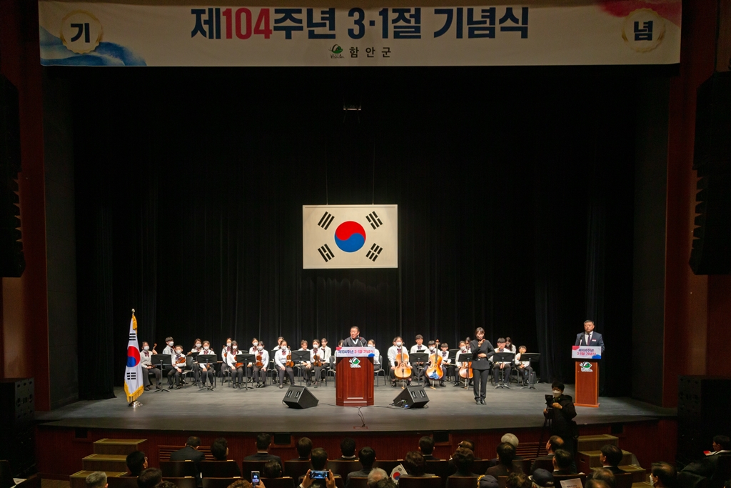 함안군은 제104주년 31절을 맞이해 1일 오전 10시 함안문화예술회관 대공연장에서 조근제 함안군수를 비롯해 도.군의원, 보훈단체 회원, 유관기관 단체장, 학생 등 450여 명이 참석한 가운데 3.1절 기념행사를 개최했다.