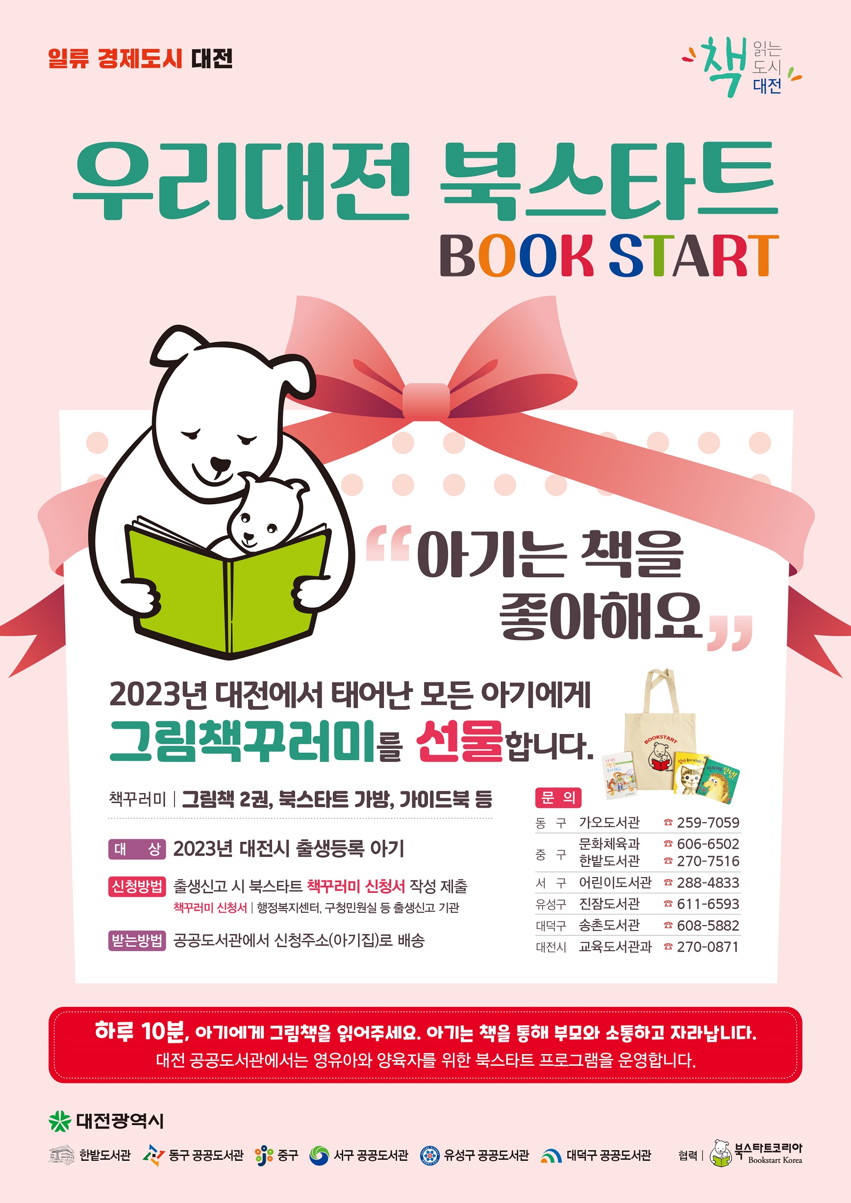 ‘2023 우리대전 북스타트’는 올해 대전에서 태어날 아기(약 7,000여 명)를 대상으로 대전시와 5개 자치구, 행정복지센터, 공공도서관, 출생신고 등록 의료기관 등 100여 개의 기관이 협력하여 추진한다. 광역시 중 당해 년도에 태어나는 모든 아기 대상의 북스타트는 대전시가 유일하다.