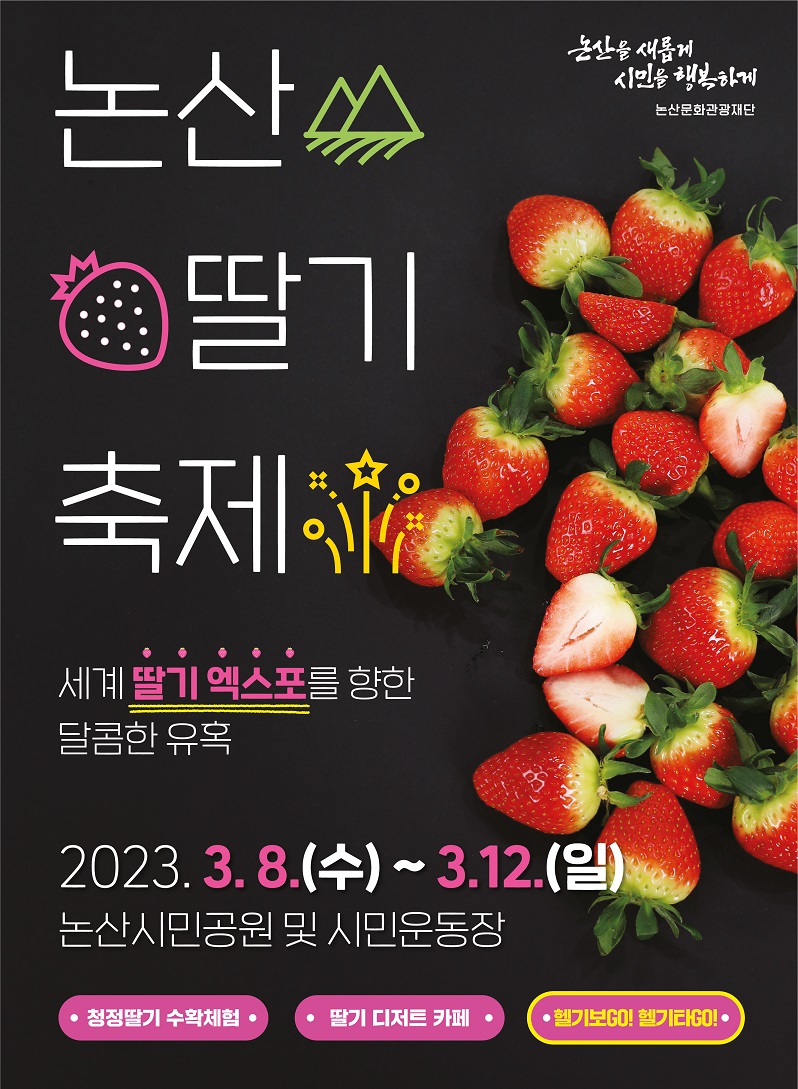 “세계 딸기 엑스포를 향한 달콤한 유혹!” 2023 논산딸기축제 개막이 어느새 닷새 앞으로 다가왔다. 논산시는 문화관광재단과 딸기축제운영위원회를 중심으로 축제 준비에 한창인 상황이다.