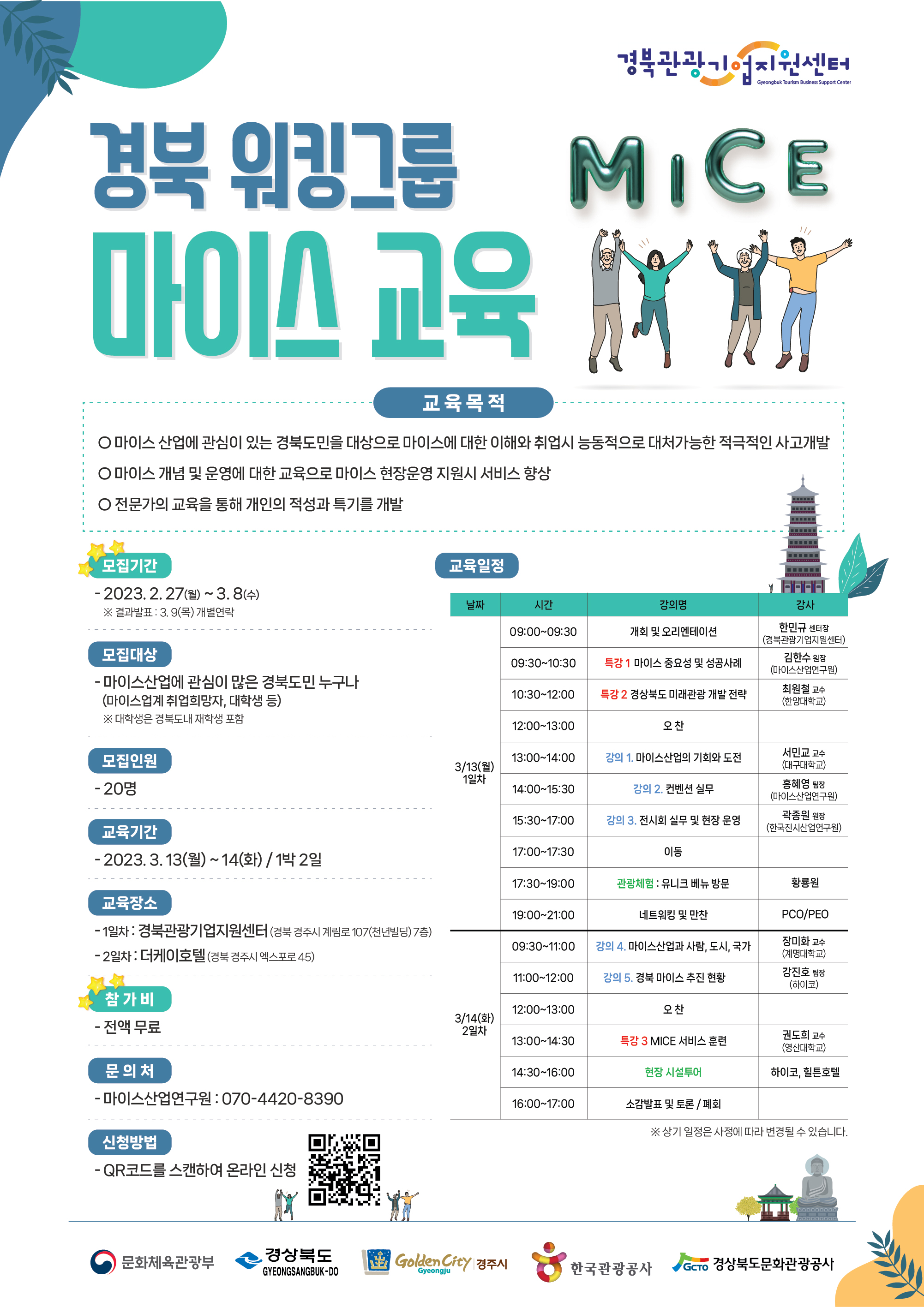 경북문화관광공사(사장 김성조, 이하 공사)는 오는 13일부터 14일까지 경북관광기업지원센터 및 경주 일원에서 경북도내 마이스산업 활성화 및 현장 인력 양성을 위한 2023 경북 워킹그룹 마이스 교육을 개최한다고 2일 밝혔다.