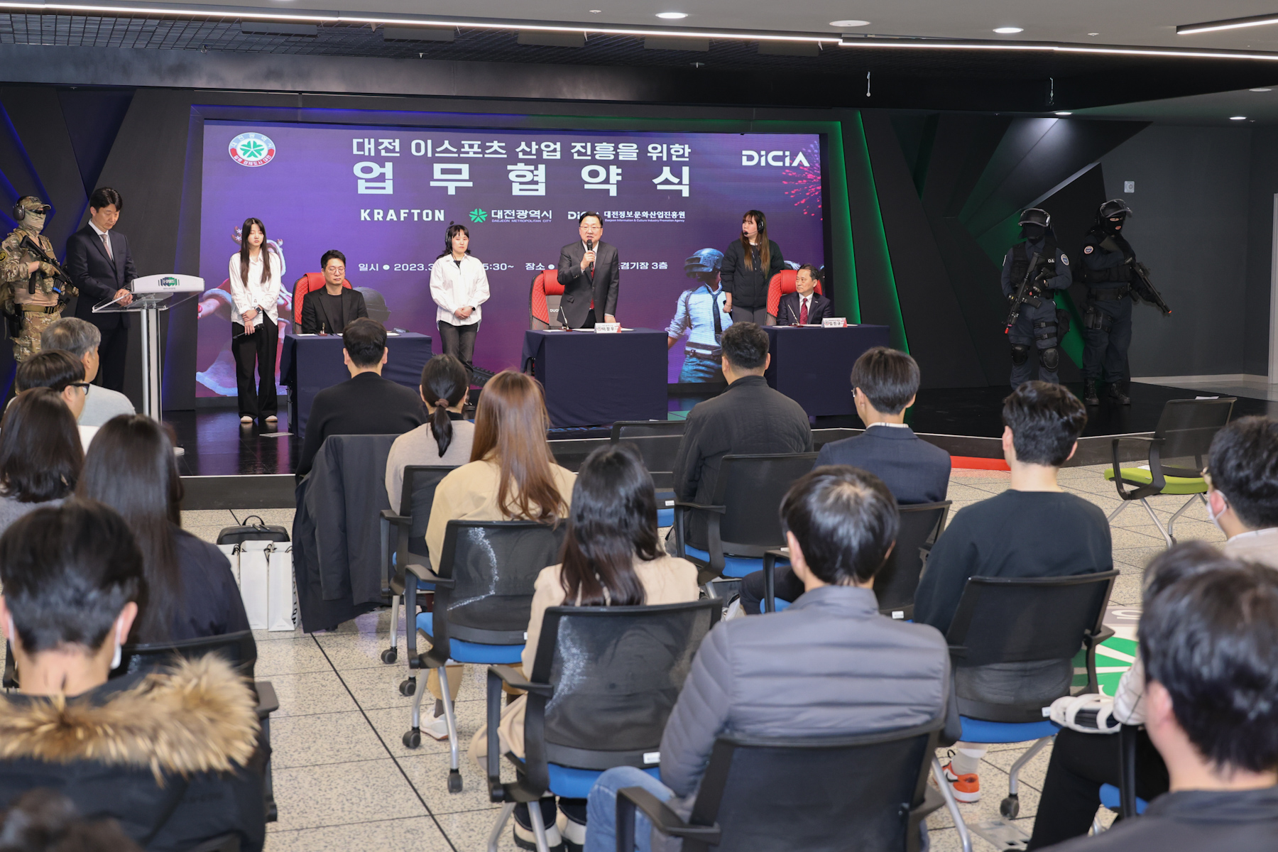 이날 협약식에는 이장우 대전시장, 이민호 크래프톤 이스포츠 총괄, 김진규 대전정보문화산업진흥원장이 참석하여 서명했다.