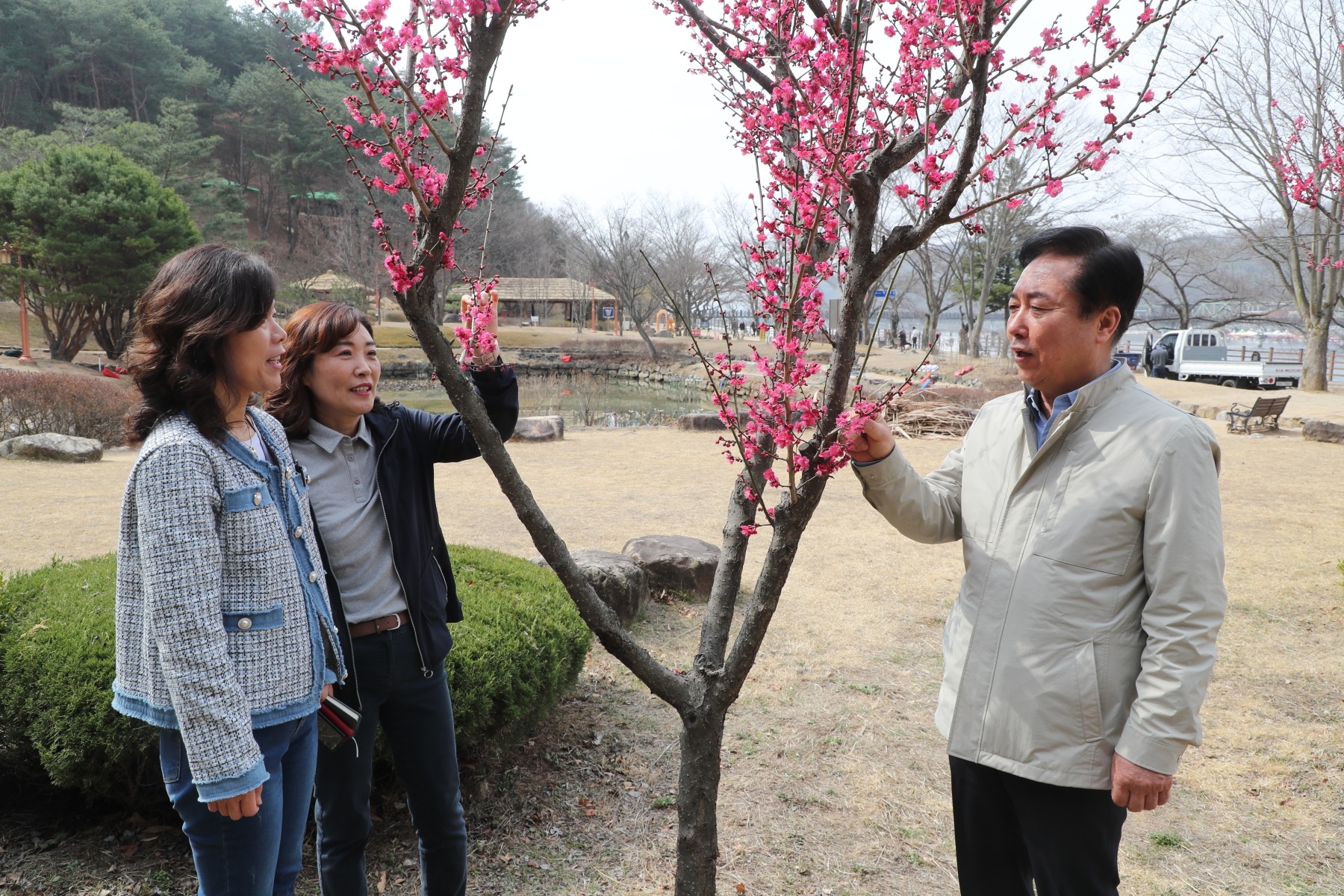 안동민속촌에 홍매화가 붉은 꽃망울을 터뜨리며 봄을 알리고 있다. 지난 11일 권기창 안동시장이 홍매화가 피기 시작한 안동민속촌, 시립박물관 일대에서 관계자들과 관광 활성화 방안을 논의했다.