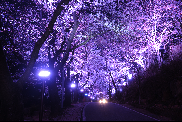 특히 화개중학교 앞 양방향 구간에는 빨강·파랑·보라 등 형형색색으로 변화하는 아름다운 경관조명이 벚꽃터널과 어우러져 환상적인 분위기를 연출한다.