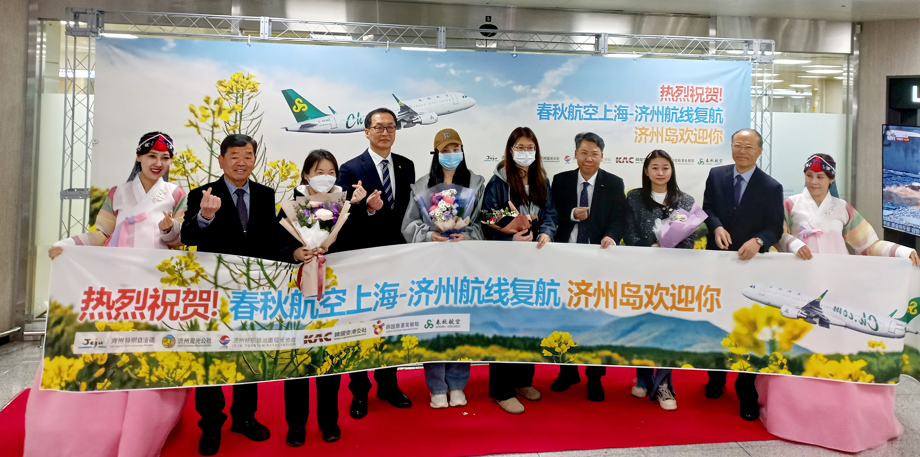 제주특별자치도와 제주관광공사(사장 고은숙)는 26일 코로나19 확산으로 장기간 중단됐던 제주-중국 직항노선 운항 재개에 따른 환영행사를 제주국제공항 국제선 입국장에서 개최했다.