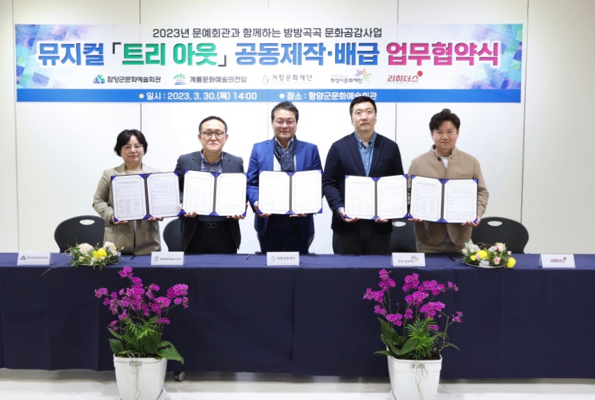 함양문화예술회관(문화시설사업소장 이양숙)은 30일 오후 2시 함양문화예술회관에서 (재)거창문화재단, 계룡시 문화예술의전당, (재)화성시문화재단, ㈜리히더스와 함께 뮤지컬 ‘트리아웃’ 공동제작을 위한 업무 협약식을 가졌다.