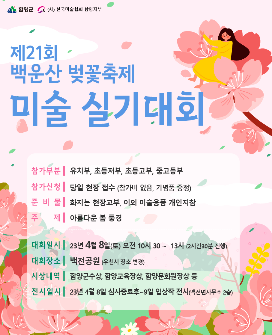 4월8일(토), 오전 10시30분부터 12시까지 진행되며 전국의 어린이집 원아부터 고등학생까지 참가할 수 있다. 신청은 현장에서 당일접수이며 자세한 문의는 (사)한국미술협회 함양지부 담당자(010-5014-1032)를 통해 문의하면 된다.