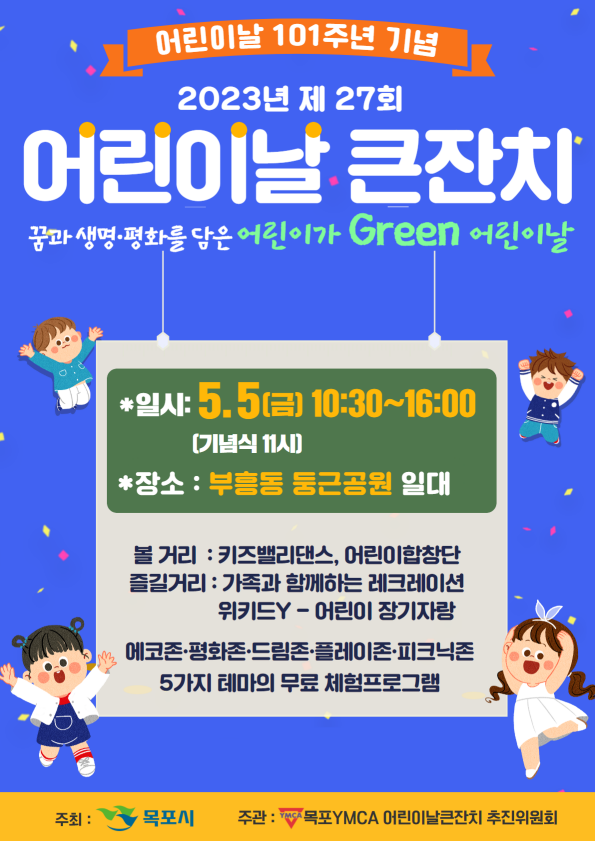 목포시가 주최하고 목포YMCA 주관하는‘제27회 어린이날큰잔치’는 「꿈과 생명·평화를 담은 어린이가 Green 어린이날」이라는 주제로 오전 10시 30분부터 오후 4시까지 어린이, 가족 등 1,000여명이 참석한 가운데 진행된다.