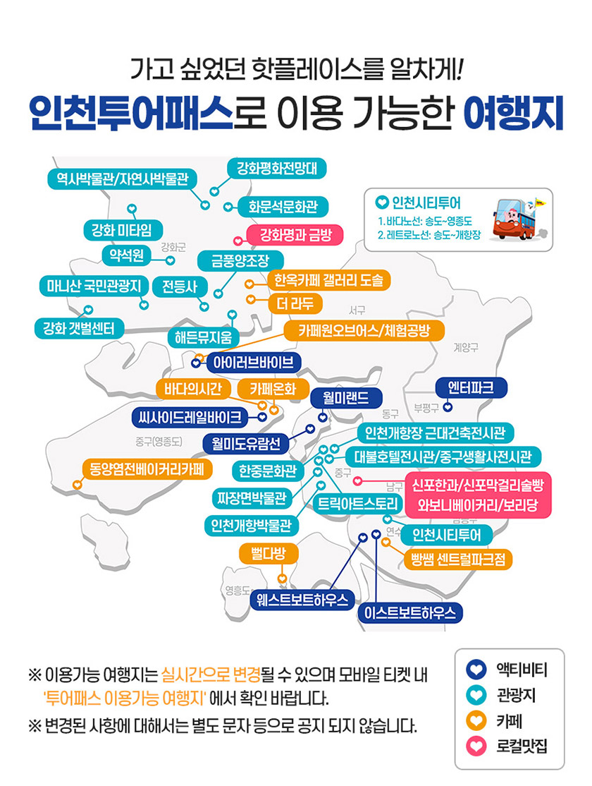 보다 자세한 정보는 인천투어패스 공식 홈페이지 및 고객센터(070-4263-7790)를 통해 확인할 수 있으며, 네이버 스마트스토어, 여기어때, 야놀자, 쿠팡 등 온라인 플랫폼에서 구매하면 된다.