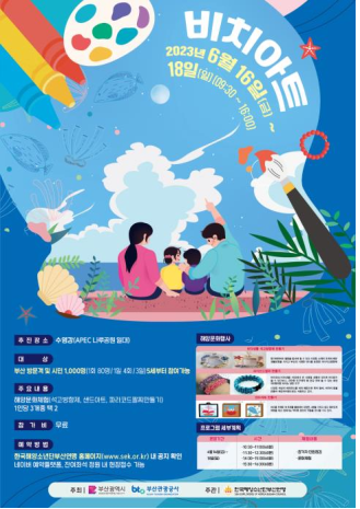 ‘수영강 비치아트 체험’ 행사는 수영강 나루공원 야외무대에서 오전 10시부터 오후 4시 30분까지 1일 4회, 회당 80명의 체험객을 대상으로 3일간 운영된다. 해양문화체험 3종(▲바다생물 석고방향제 만들기, ▲파라코드 팔찌 만들기, ▲샌드아트) 중 2개를 선택하여 체험할 수 있다.