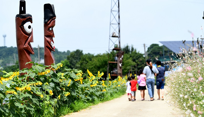 다가오는 토요일, 채운면 야화1리를 찾는다면 넘실거리는 해바라기 물결은 물론 마을의 또 다른 명물인 솟대 풍경도 감상할 수 있다.