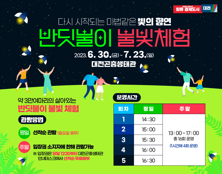 이번 행사에는 대전곤충생태관에서 대량 사육한 애반딧불이 3만여 마리가 전시되며, 청정지역이 아닌 도심 속에서 펼쳐지는 반딧불이 불빛의 웅장함을 감상해볼 수 있다.