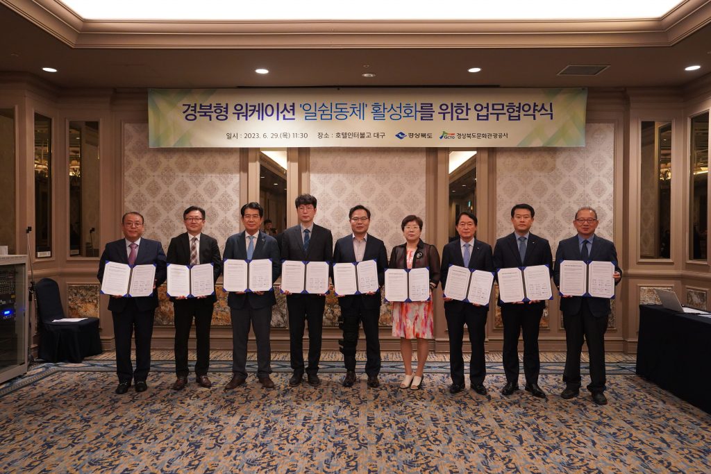 경상북도와 경북문화관광공사(사장 김성조, 이하 공사)는 29일 대구 인터불고 호텔에서 김학홍 경상북도 행정부지사, 대구·경북 상공회의소 등 7개 기관 관계자가 참석한 가운데 경북형 *워케이션‘일쉼동체’활성화를 위한 업무협약을 체결했다고 밝혔다.