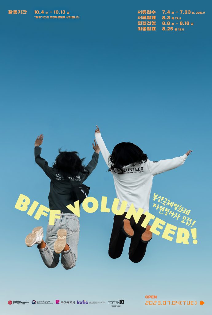 제28회 부산국제영화제가 7월 23일(일)까지 올해의 자원봉사자 모집을 진행한다. ▲경영지원실, ▲홍보실, ▲프로그램실, ▲커뮤니티비프실, ▲대외협력실, ▲지석영화연구소, ▲아시아콘텐츠&필름마켓실 등 총 7개 부서 22개 분야에서 약 700명을 선발할 예정이다.