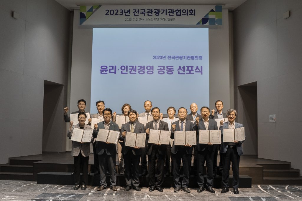 한국관광공사(이하 공사)와 전국 15개 지역관광공사·관광재단 협의체인 ‘전국관광기관협의회*‘는 오늘(7.6) 경기도 고양 소노캄호텔에서 ’윤리·인권경영 공동 선포식‘을 개최했다.