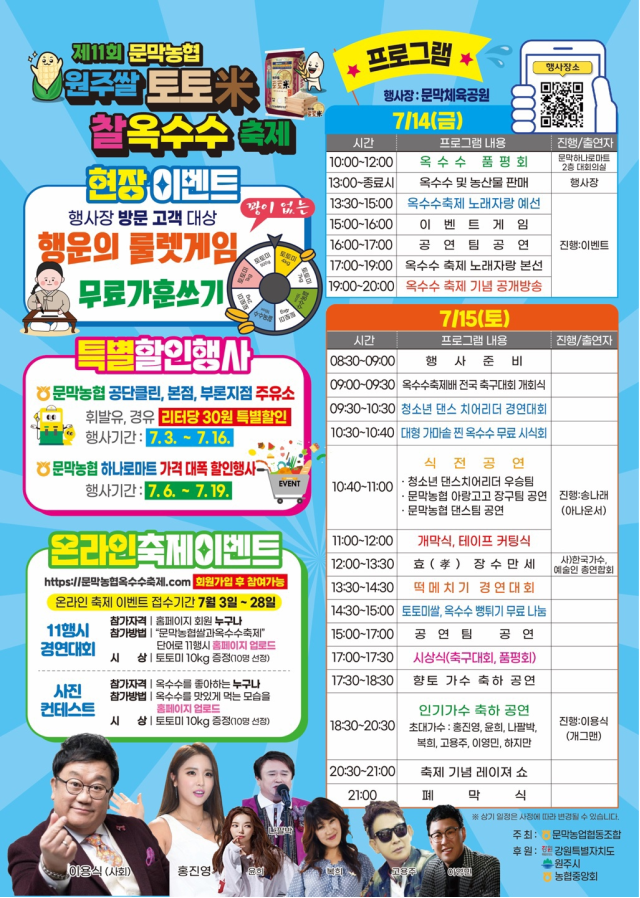 문막농협이 주최하고 원주시가 후원하는 ‘제11회 문막농협 원주쌀 토토미 및 찰옥수수 축제’가 오는 14일부터 이틀간 문막체육공원 둔치에서 개최된다.