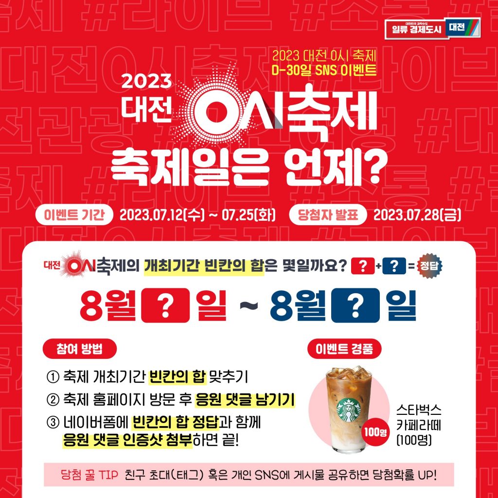 이번 이벤트는 대전 0시 축제의 행사 기간을 알리기 위해 진행되는 것으로, 행사 기간 2023년 8월 □일부터 8월 □일까지에서, 네모칸에 들어갈 날짜를 합산한 숫자를 맞추는 퀴즈 이벤트이다.