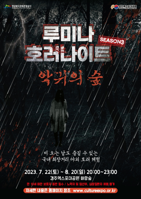 경상북도문화관광공사(사장 김성조, 이하 공사)는 한층 더 업그레이드 된 공포로 돌아온 ‘루미나 호러나이트 시즌3 – 악귀의 숲’을 오는 22일부터 다음달 20일까지 30일간 경주엑스포대공원 화랑숲에서 진행한다.