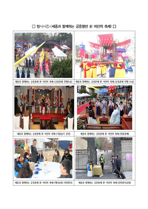 또한 축제 기간에 궁중혼례식, 전통혼례식을 올리고자 하는 예비 신랑·신부는 나이 제한 없이 참가할 수 있고, 1차 서류심사, 2차 면접심사, 3차 궁중복식 심사를 거쳐 심사위원회에서 최종 2쌍의 주인공을 선발한다.