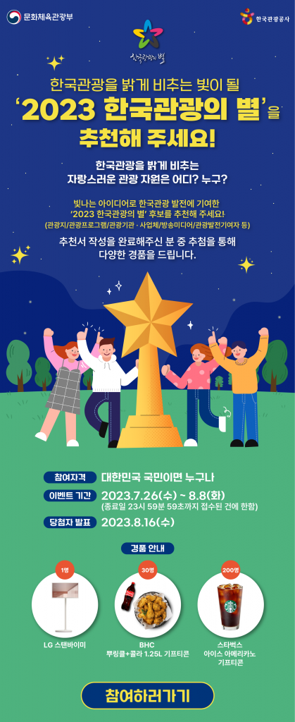 문화체육관광부와 한국관광공사(이하 공사)는 7월 26일(수)부터 8월 8일(화)까지 ‘2023 한국관광의 별’ 후보 추천 이벤트를 진행한다.