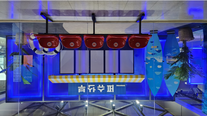 청량한 색감과 파도 패턴의 바닥을 연출하고, 구름 모양의 조명과 연기를 통해 구름 위에 떠 있는 듯한 기분을 만끽할 수 있도록 조성했다.