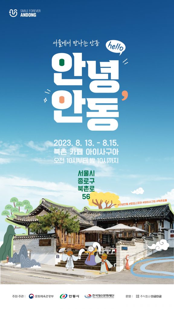 이번 팝업스토어는 서울의 중심에서 관광거점도시‘안동’을 체험해보는 색다른 콘셉트로 8월 13일부터 15일까지 북촌한옥마을 내 카페‘아이사구아’에서 사흘간 진행될 예정이다.
