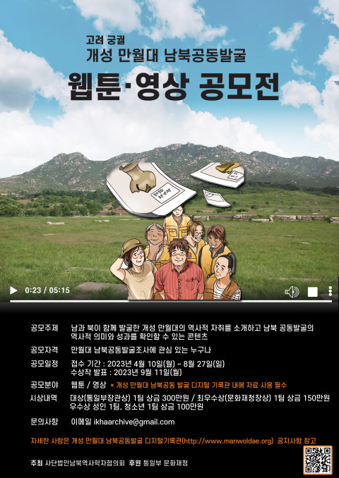 통일부와 문화재청이 후원하고, 남북역사학자협의회가 주최하는 2023년 ‘고려 궁궐 개성 만월대 남북공동발굴 웹툰·영상 공모전’이 개최된다.
