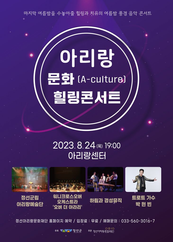 최종수 정선아리랑재단 이사장은 “무더위가 한풀 꺾이는 여름의 끝자락에 전통과 문화, 현대적인 음악이 함께 어우러지는 아리랑문화 힐링 콘서트 공연에 많은 참여와 성원을 부탁드린다”고 말했다.