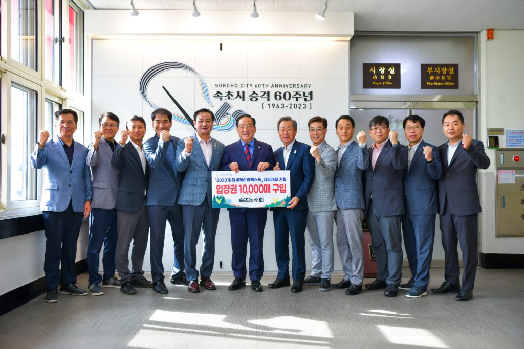 속초시 농수산업 관련 기관단체장들로 구성된 농수회가 다음 달 22일부터 고성군에서 열리는 ‘2023 강원세계산림엑스포’의 성공 개최를 기원하면서 입장권 1만 매를 구매하기로 했다.