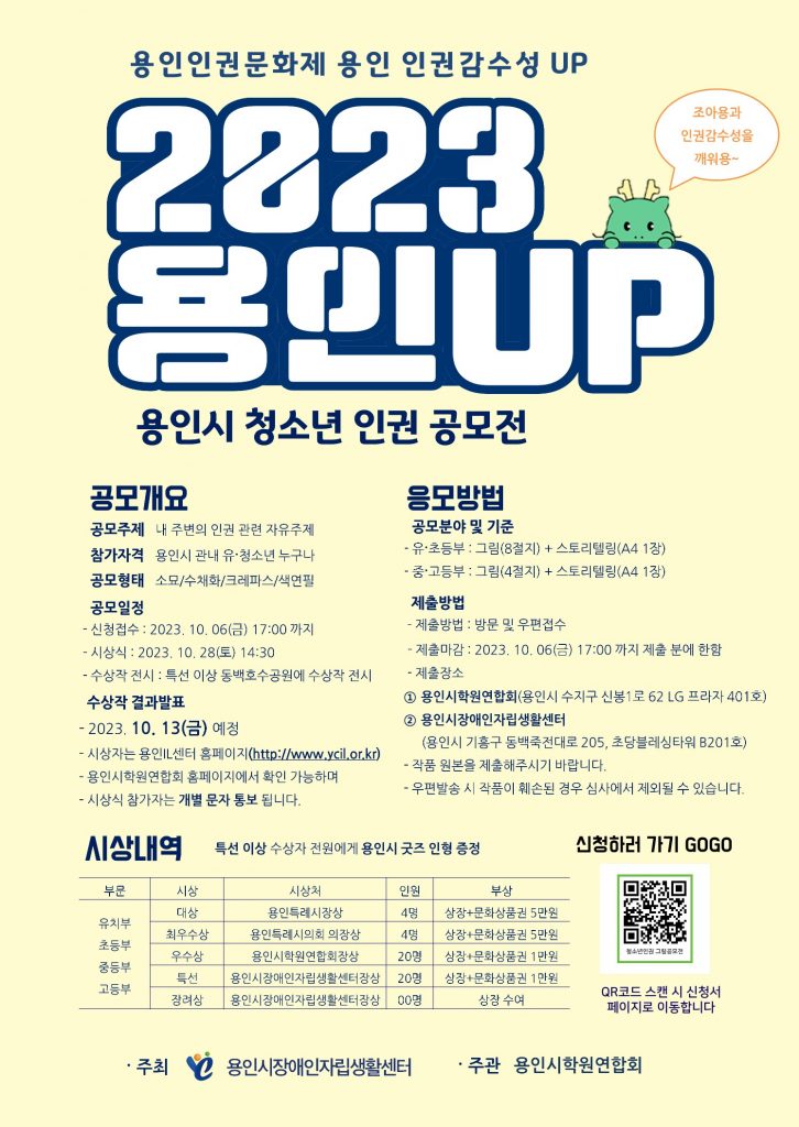 또한 선정된 작품은 10월 28일 용인동백호수공원에서 진행되는 [2023 용인UP 용인인권 문화제]에서 시상 및 작품전시회를 진행한다.