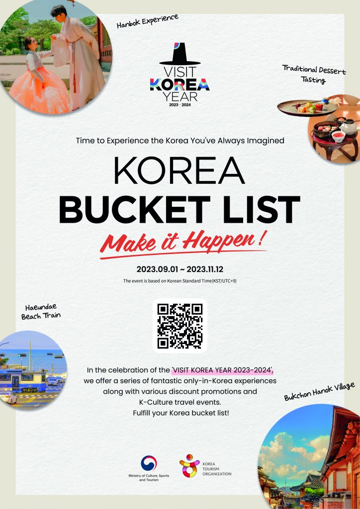 문화체육관광부와 한국관광공사(이하 공사)는 ‘2023~2024 한국방문의 해’를 기념해, 지난 1일부터 오는 11월 12일까지 방한 외국인 관광객이 K-팝, 뷰티, 푸드 등 다양한 한국의 매력을 경험할 수 있는 ‘코리아 버킷리스트(KOREA Bucket List, Make it Happen!)’ 온오프라인 프로모션을 추진하고 있다.