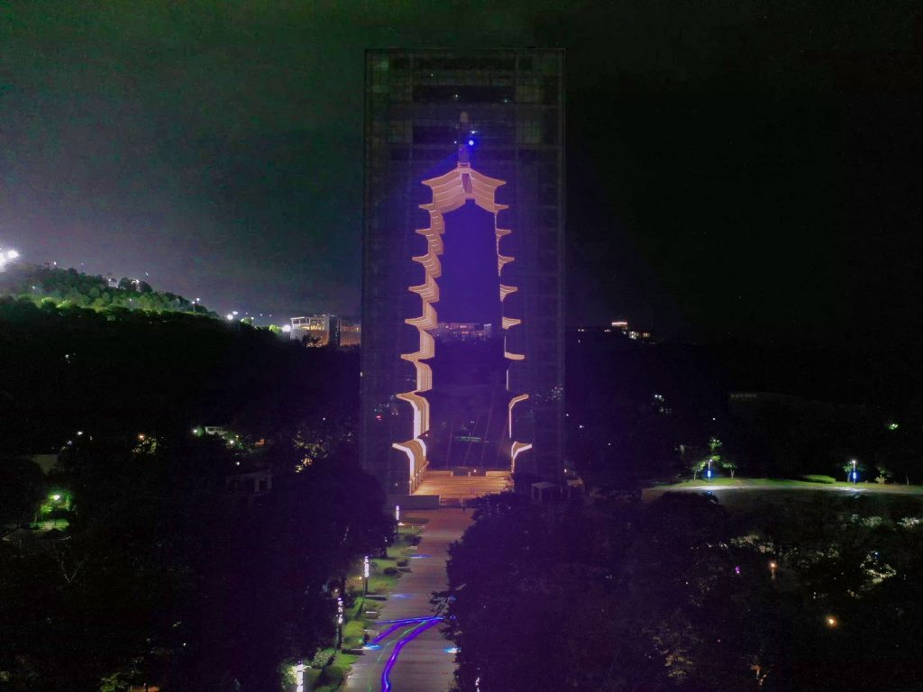 타워 전망층에 설치된 레이저는 초록색과 보라색의 빛을 상하좌우로 비추며 경주엑스포대공원의 밤을 빛으로 꾸미고, 타워 앞 주작대로와 왕경 숲을 신비로운 빛의 공간으로 바꾸어 놓는다.