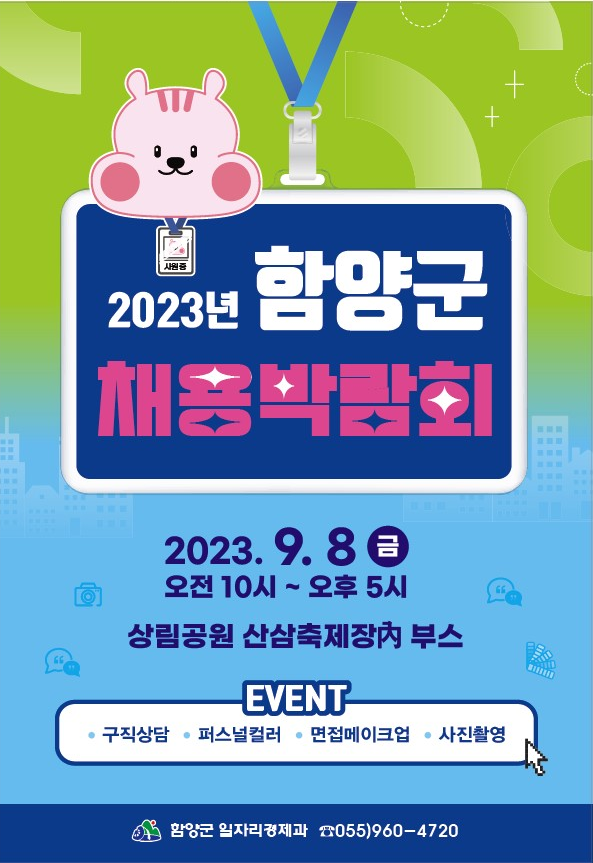 함양군은 제18회 함양산삼축제 기간 중인 오는 9월 8일 오전 10시부터 오후 5시까지 상림공원 인근 산삼축제장 부스에서 ‘2023년 함양군 채용박람회’를 개최한다.