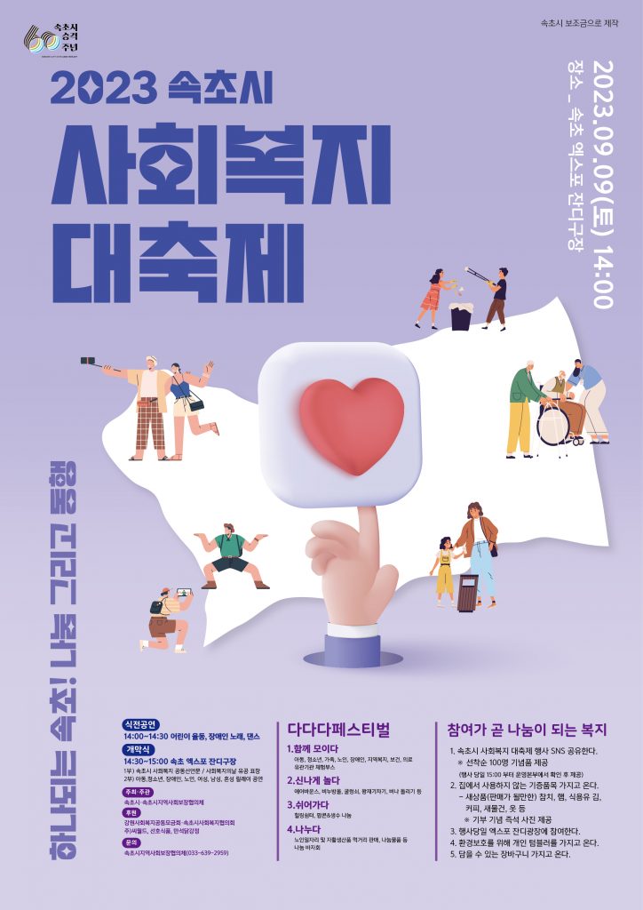 속초시가 9. 9.(토) 오후 2시부터 6시까지 청초호 유원지 잔디광장 일원에서 ‘하나되는 속초! 나눔, 그리고 동행’이라는 부제 아래 ‘시 승격 60주년 기념, 2023 속초시 사회복지 대축제’를 개최한다.