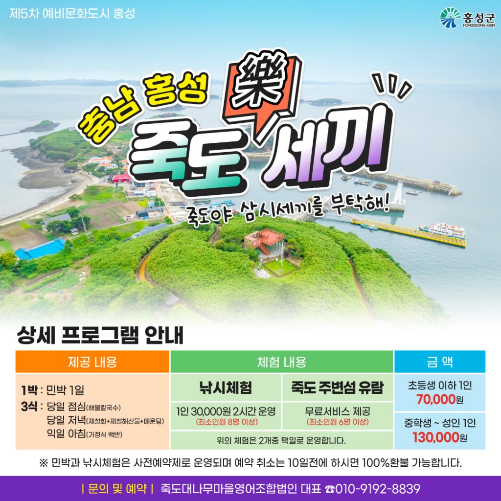 프로그램은 숙박 1박에 3끼(당일 점심, 당일 저녁, 익일 아침)을 초등학생 이하 7만원, 중학생부터 성인은 13만원에 제공하고, 낚시와 죽도 주변섬 유람 등의 체험활동까지 함께 제공하는 오감만족 여행을 선사한다.