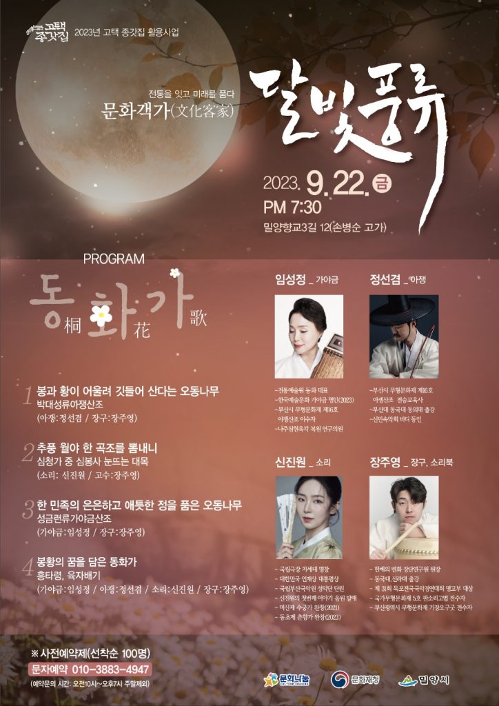 밀양시는 오는 22일 오후 7시 30분 교동 손병순 고가에서 ‘2023년 고택종갓집 활용사업’의 달빛풍류 공연을 한다고 밝혔다.