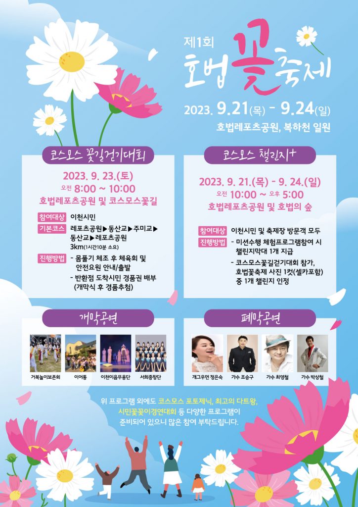 이천시 호법면 호법의 숲 코스모스길에서 이천시민 화합과 건강증진을 위해 오는 23일 오전 8시‘제2회 호법의숲코스모스길 걷기대회(제147회 이천시민 한마음 걷기대회)’가 개최된다.
