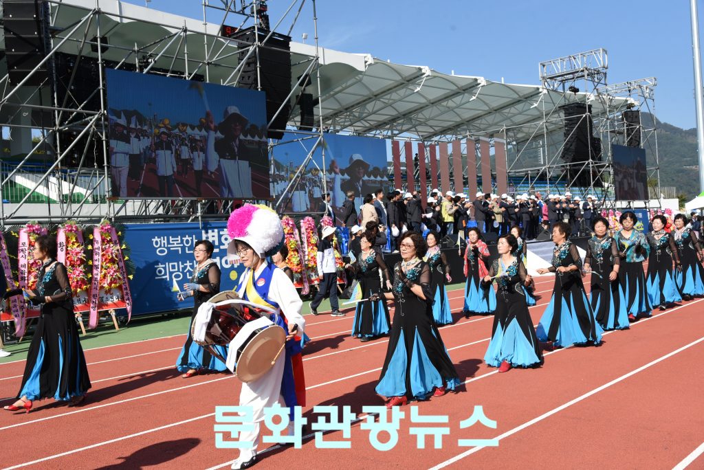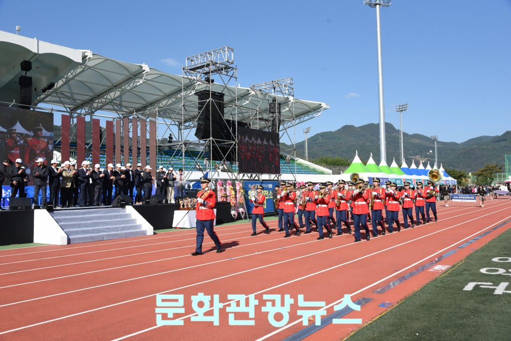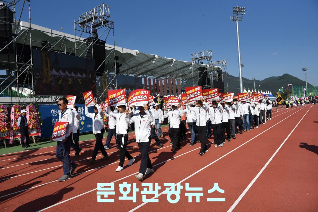 이날 체육대회는 오전 09시 40분에 50사단 군악대를 시작으로 6개 읍면과 향우부, 직장부 등 500여 명의 선수들이 입장식을 가졌다.