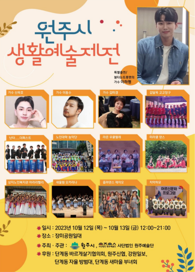 (사)원주예술단(대표 강대호)은 원주시에서 활동하는 예술인 및 생활예술 동아리와 함께 10월 12일~13일 이틀간 단계동 장미공원 야외공연장에서 ‘생활예술제전’을 개최한다