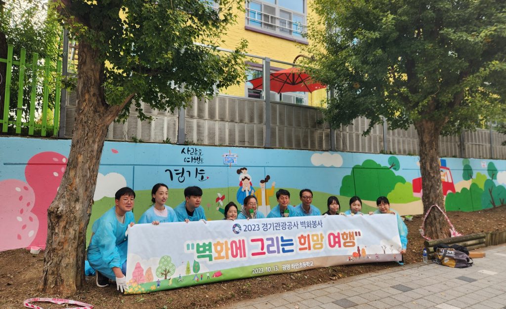 경기관광공사(사장 조원용, 이하 공사)가 10/13일(금) 오후, 사회공헌활동 일환중 하나로 도내 교육 환경 개선을 위한 ‘여행 벽화 그리기’ 봉사활동을 펼쳤다.