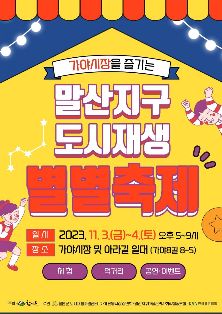 함안군은 오는 11월 3일(금)~4일(토) 양일간 오후 5시부터 9시까지 가야전통시장과 아라길 일원에서 ‘말산지구 도시재생 별별 축제’를 개최한다.