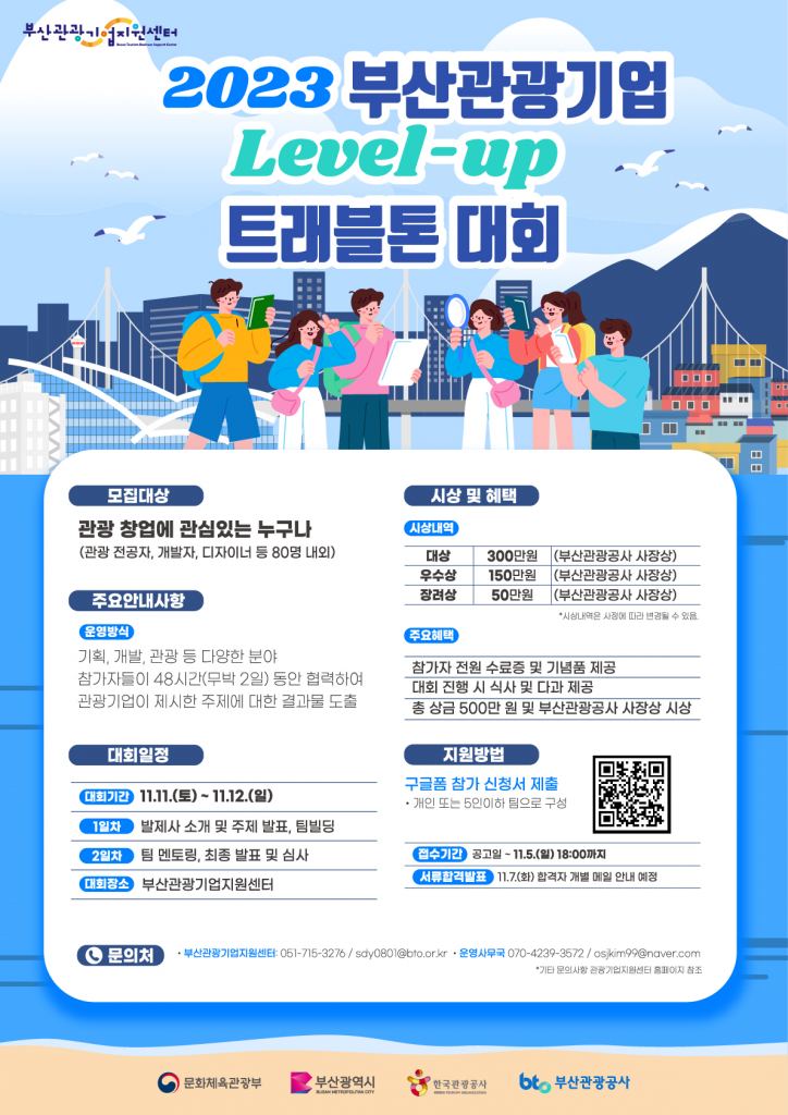 부산광역시(시장 박형준)와 부산관광공사(사장 이정실, 이하 공사)는 문화체육관광부와 한국관광공사(사장 김장실)의 지원으로 ‘2023 부산관광기업 Level-up 트래블톤(이하 트래블톤)’대회를 오는 11일부터 12일까지 무박 2일간 부산관광기업지원센터(이하 센터)에서 개최한다고 2일 밝혔다.