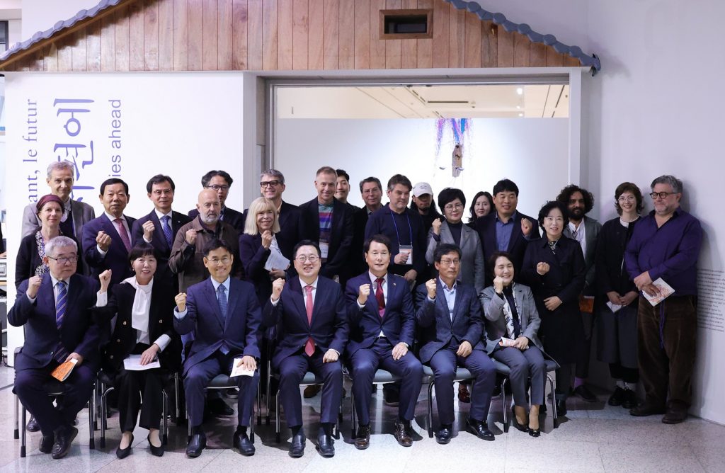 대전시립미술관 세계유명미술특별전 <미래저편에 : 대전 1993/2023> 개막식에 참석한 이장우 대전시장과 이상래 시의회 의장, 김환균 대전 MBC 사장 등 내빈이 작품을 관람하고 있다.