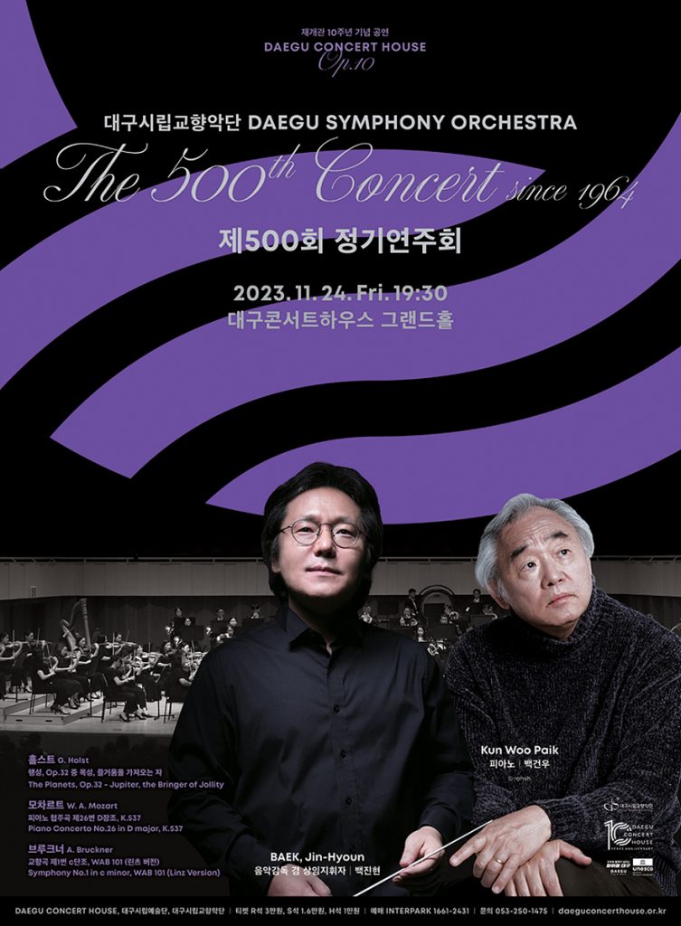 2013년 11월, 클래식 콘서트 전용홀로 거듭난 대구콘서트하우스의 재개관 10주년 기념 공연이기도 한 이날 무대는 음악감독 겸 상임지휘자 백진현이 이끌고, ‘건반 위의 구도자’로 불리는 피아니스트 백건우가 협연한다. 대구시향은 500번째 정기연주회를 개최하기까지 함께해 준 관객의 사랑에 감사하는 마음으로 감동의 순간을 선사하고자 고전에서 후기 낭만, 근대까지 폭넓은 레퍼토리를 준비했다.
